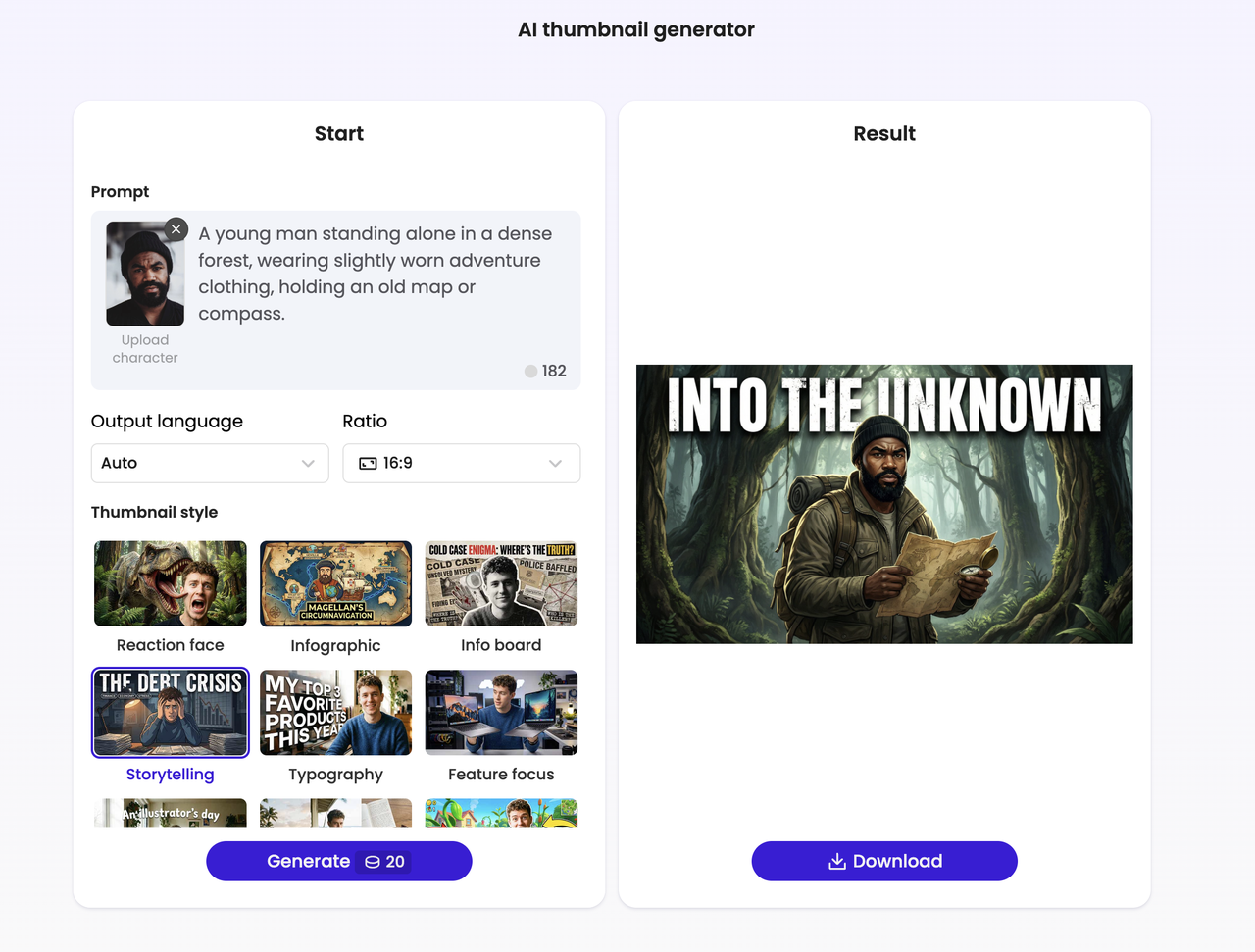 Yes! Mootion supports video thumbnail generation in multiple ways. You can create thumbnails directly using the Thumbnail tool in your workspace, or generate a thumbnail after your storyboard is complete—making it easy to produce a polished cover that matches your video content.