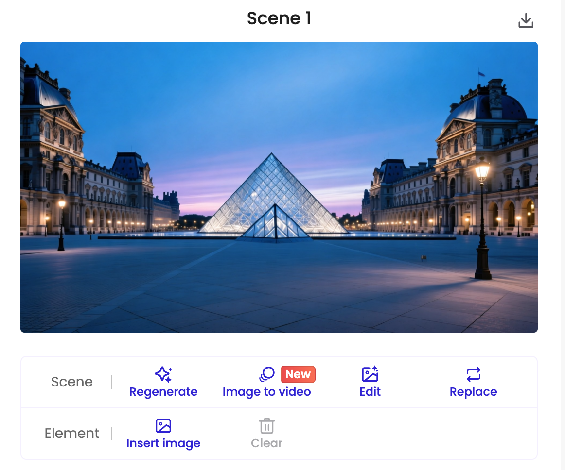 In Mootion, a storyboard is made of several scenes which can be edited in an intuitive and natural way(Add, Split, Merge, Delete).